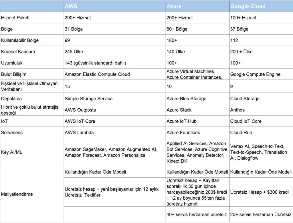 Merhaba, 3 büyük global bulut servis sağlayıcının hizmet ve bölge sayısı karşılaştırmaları şöyledir