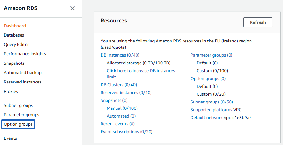 AWS RDS Konsoluna gidin ve Options Groups menüsüne tıklayın.