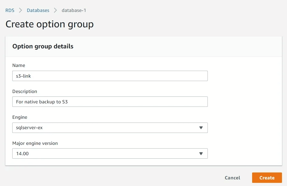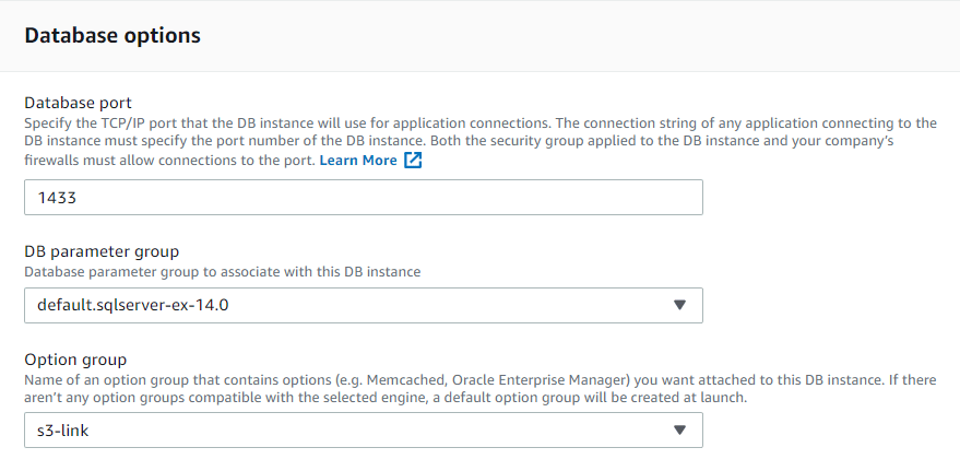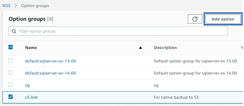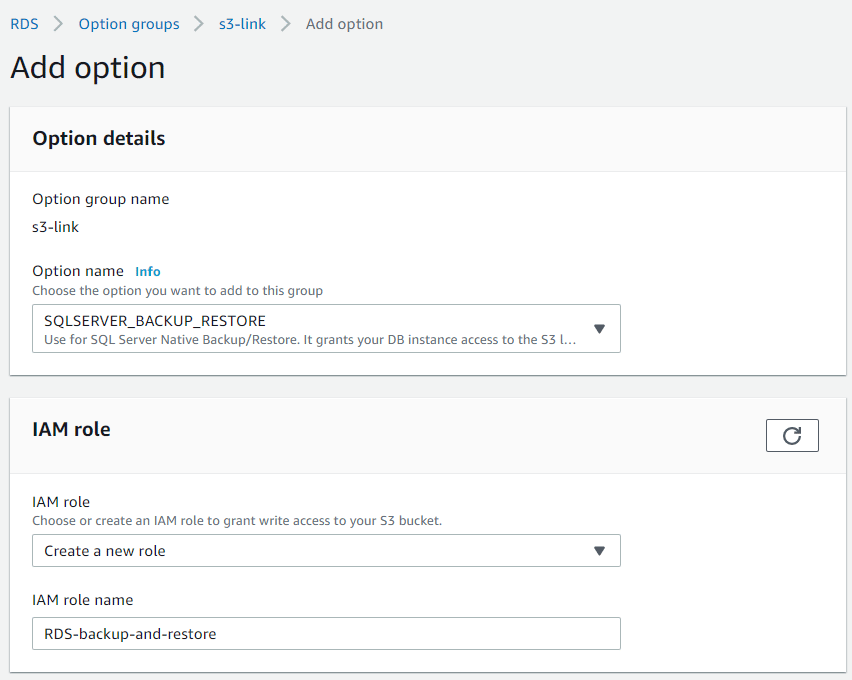 “Add Options” butonuna tıklayarak seçeneği bu gruba ekleyin. “SQLSERVER_BACKUP_RESTORE” öğesini seçin ve “IAM rolü” bölümünde yeni bir rol oluşturun. Gerekli tüm izinlere sahip rol oluşturulacaktır.